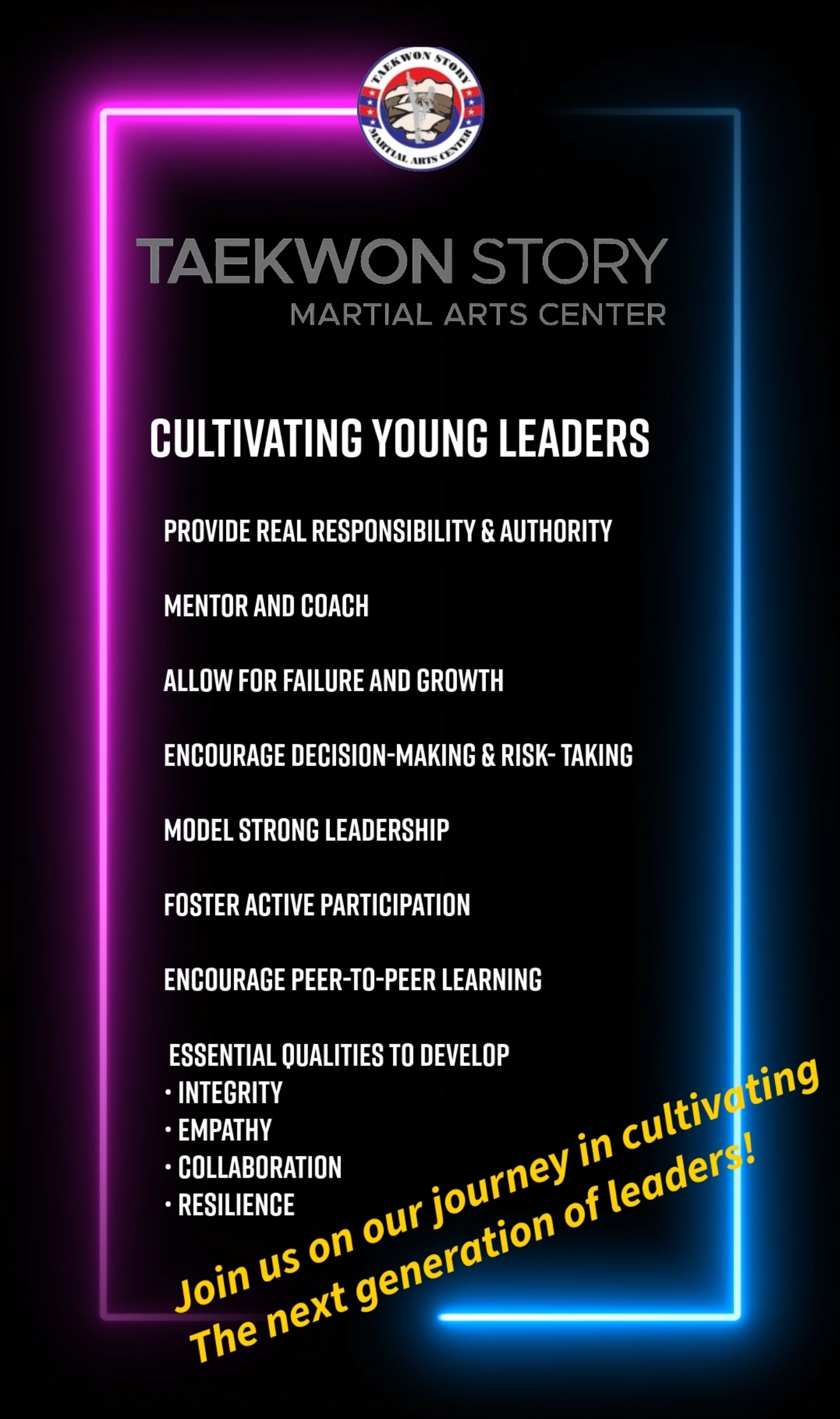 Our Mission: Cultivate future leaders through Taekwondo training and discipline.